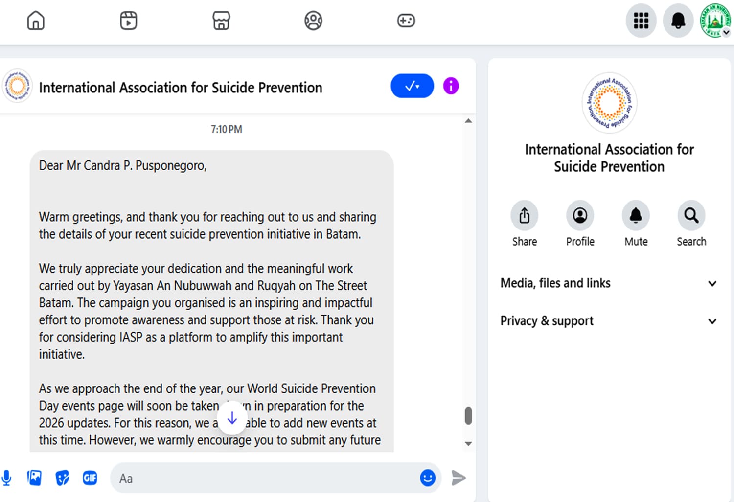 “Kami sangat menghargai dedikasi Anda dan pekerjaan bermakna yang dilakukan oleh Yayasan An Nubuwwah dan Ruqyah on The Street (RoS) Batam. Kampanye yang Anda selenggarakan merupakan upaya yang menginspirasi dan berdampak besar dalam meningkatkan kesadaran dan memberikan dukungan bagi mereka yang berisiko,” tulis IASP dalam pernyataan resminya, Rabu (10/12/2025).