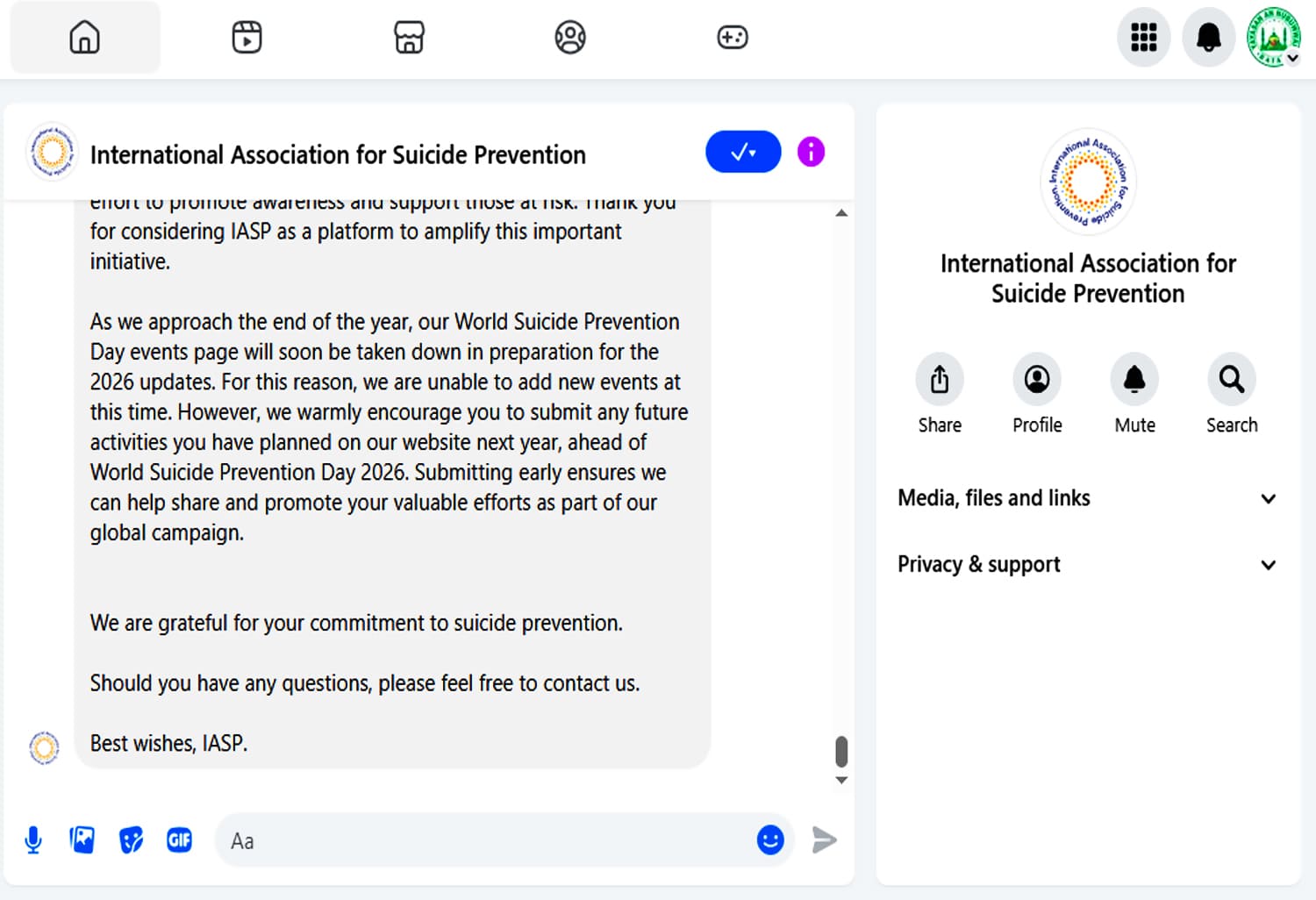 Sebagai lembaga internasional yang setiap tahun memimpin kampanye World Suicide Prevention Day (WSPD), IASP menyampaikan bahwa halaman acara resmi mereka sedang ditutup untuk persiapan pembaruan menuju agenda 2026. Karena itu, mereka belum dapat memasukkan kegiatan ruqyah akbar Jembatan I Barelang ke dalam daftar program tahun 2025.